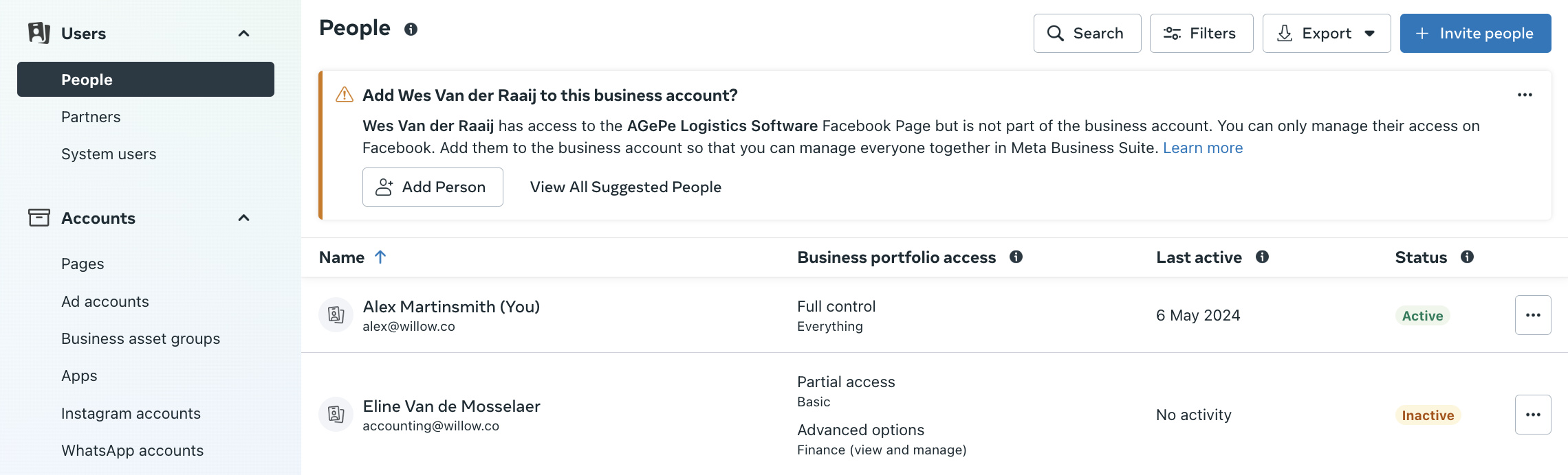 Ga naar Meta Business Suite → Instellingen → Personen om te controleren of je de juiste rechten hebt. Hieronder zie je twee gebruikerstypes: Volledige controle en Gedeeltelijke toegang. Je moet Volledige controle hebben.