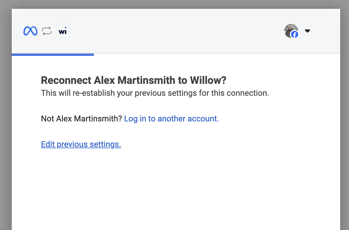 Nadat je een kanaal van Willow hebt toegevoegd, word je door het integratieproces van Meta geleid. Als dit de eerste keer is dat je dit doet, ziet het eerste scherm er als volgt uit: